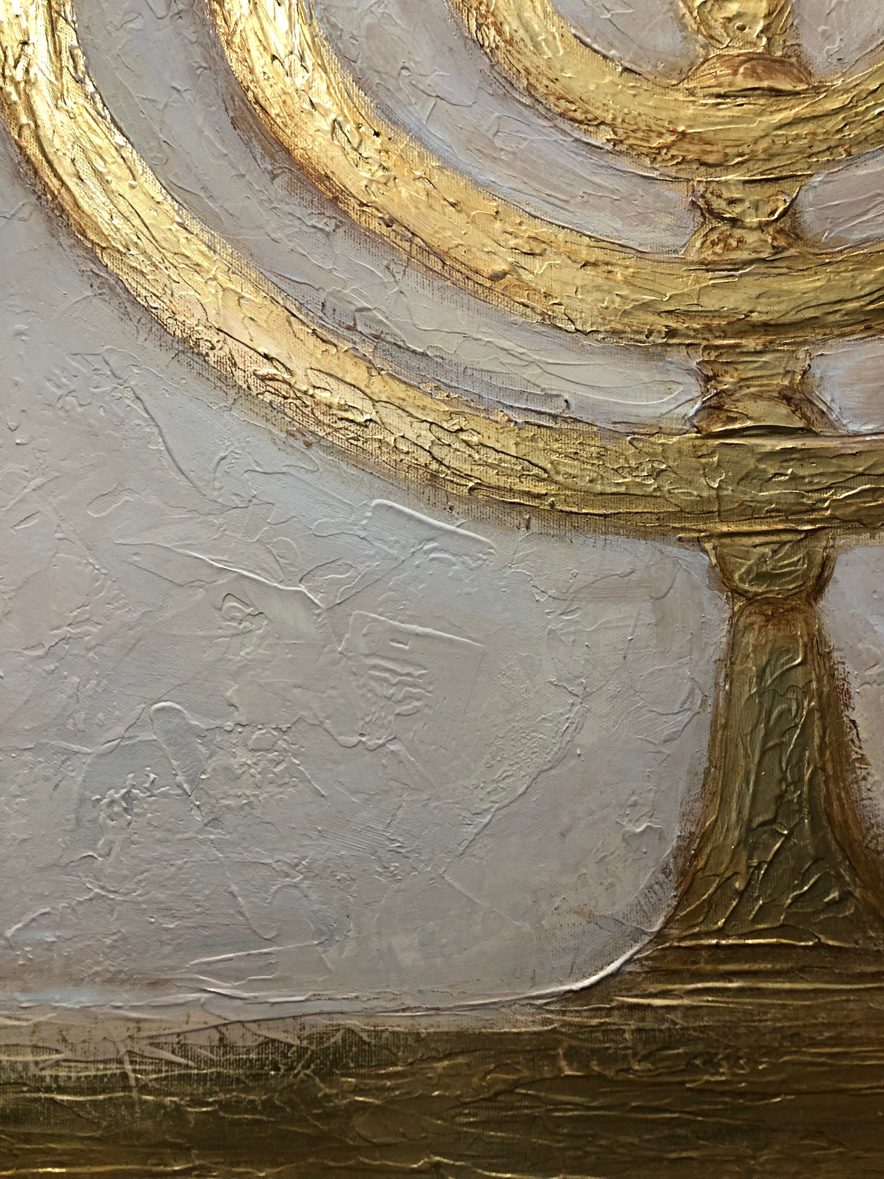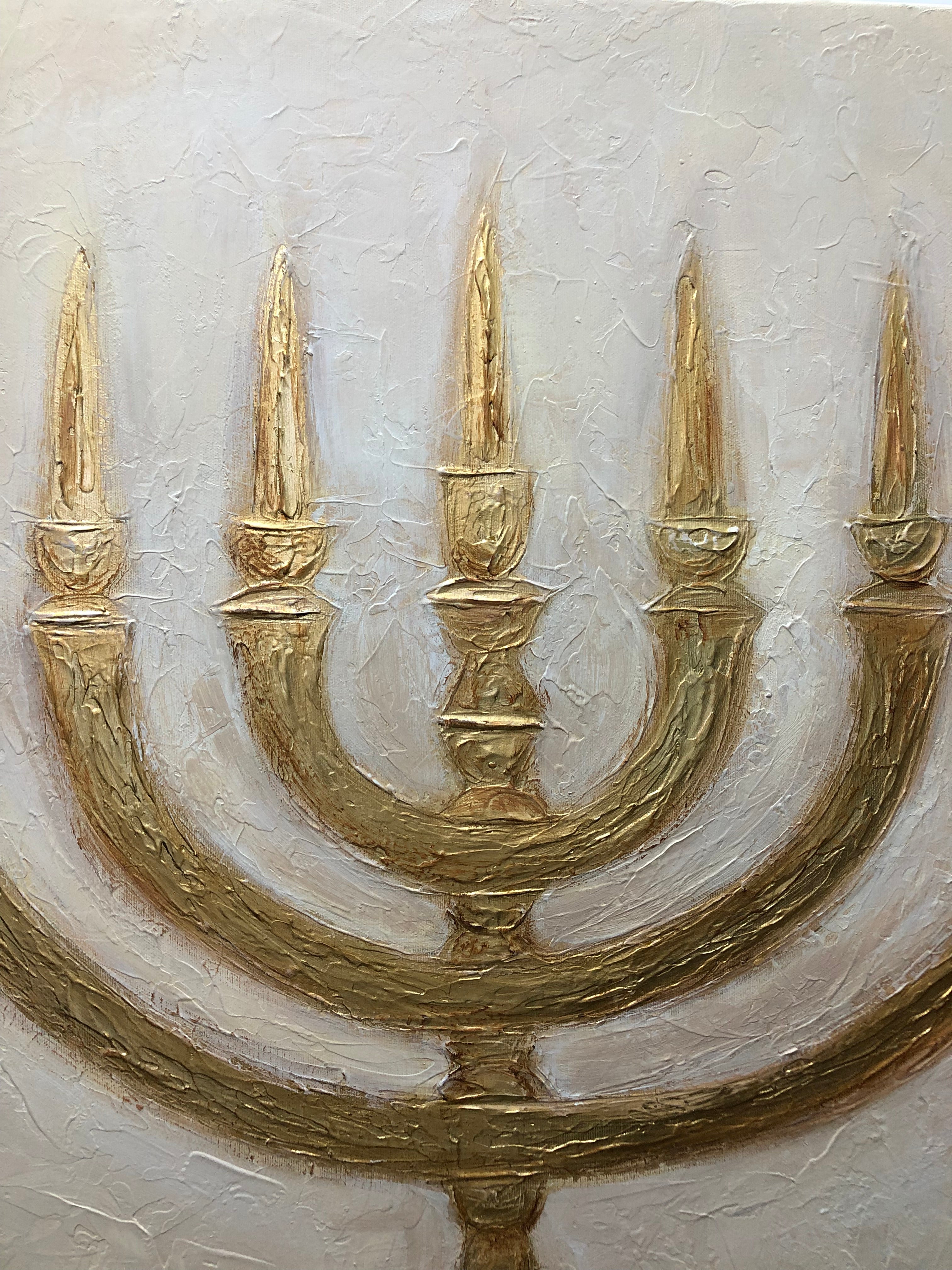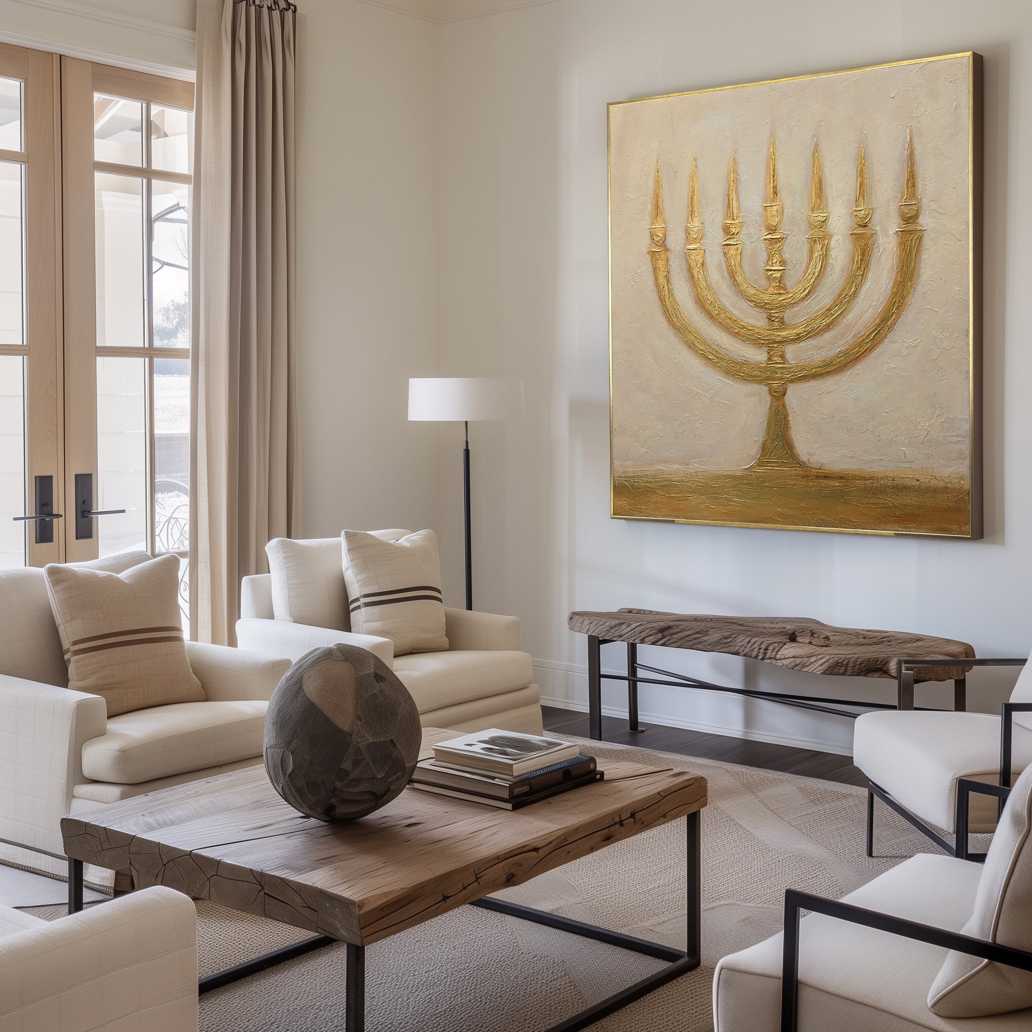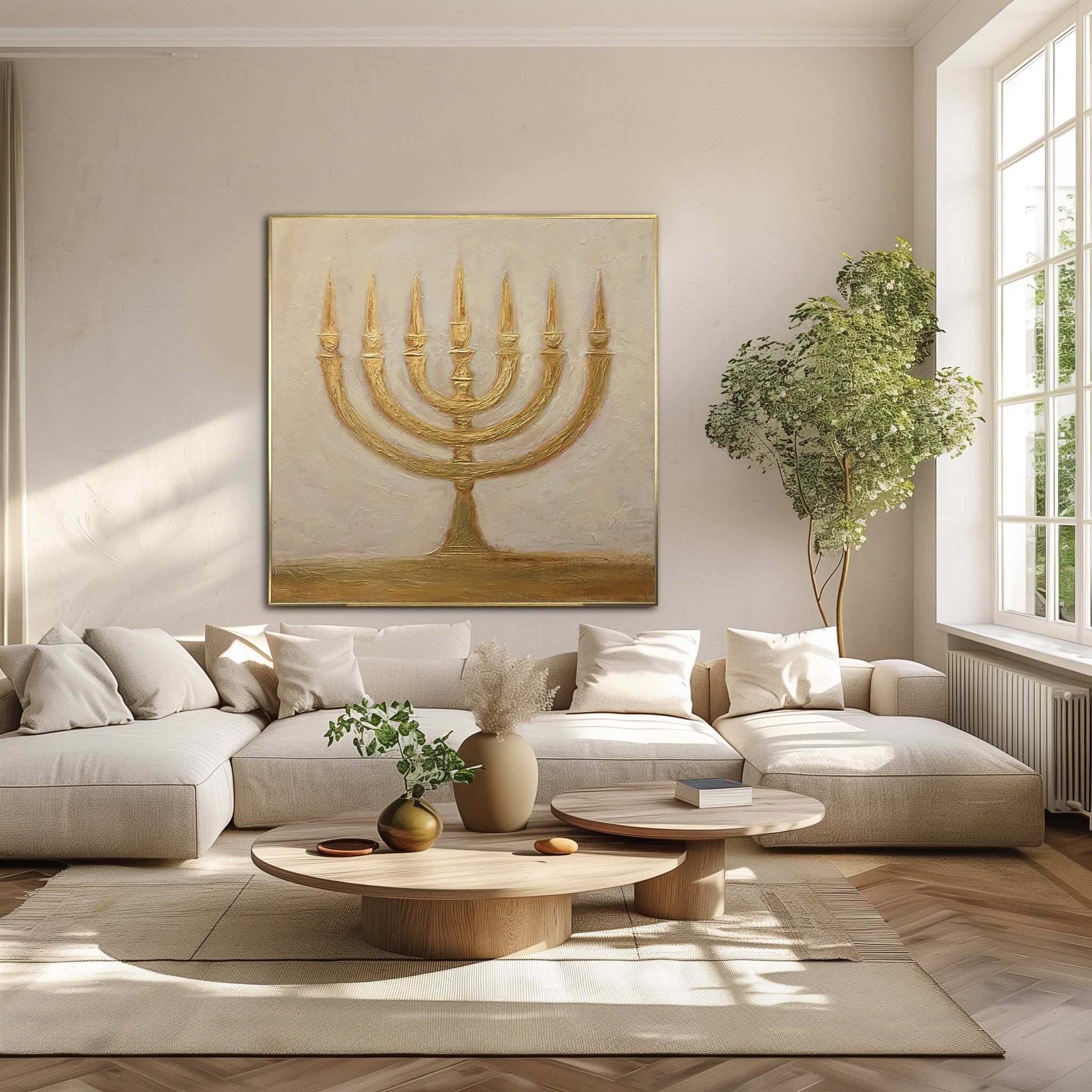 Dieses handgefertigte Menora-Gemälde mit seiner strukturierten Oberfläche verleiht Ihrem Wohnzimmer oder Eingangsbereich elegante Symbolik und warme Goldtöne. Ein einzigartiges jüdisches Kunstwerk für moderne Wohnungen – bestellen Sie noch heute!