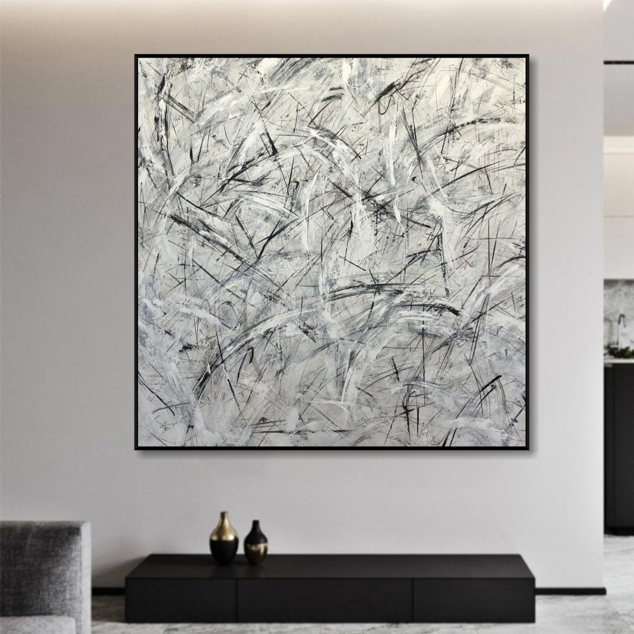 Verschönern Sie Ihren Wohnraum mit diesem atemberaubenden abstrakten Gemälde, das eine harmonische Mischung aus schwarzen, weißen und grauen Farbtönen aufweist. Dieses große Kunstwerk auf Leinwand fängt mit seinen ausdrucksstarken Pinselstrichen und dynamischen Linien die Essenz des minimalistischen Designs ein. Es eignet sich perfekt für eine zeitgenössische Einrichtung und verleiht jedem Raum einen Hauch von moderner Raffinesse. Genießen Sie die emotionale Tiefe und künstlerische Freiheit, die dieses monochrome Meisterwerk in Ihr Zuhause bringt. Verwandeln Sie Ihren Raum mit diesem fesselnden Wandbild.